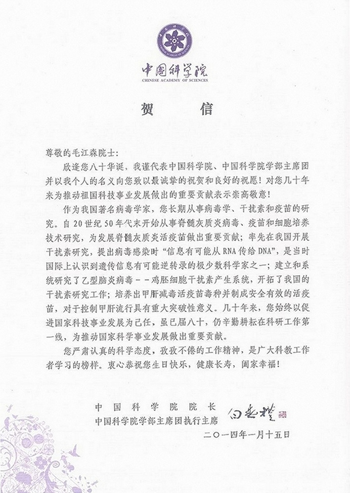 中国科学院、中国科学院学部主席团向毛江森院士发来贺信