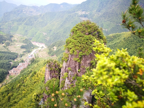 次日,我们来到了国际摄影创作基地——国家4A级南尖岩景区。景区内融奇峰怪石、林海云雾、飞瀑流泉、珍禽异兽于一炉,丘陵起伏多姿,田园村落景致宜人。虽然天公不作美,没能如愿看到云海梯田,但不影响我们出游的好心情。相比昨天的千佛山来说,南尖岩景区显得更为大气!这里的美丽风景是纯天然的,体现的是自然的真我,不需要添加任何外在的修饰。与千佛山不同的是,这里不走回头路,一路峻峭的石阶组成先下山后上山的环形山路。从景区入口后,首先印入眼帘的是大片的梯田,错落有致地散布在群山中,层峦叠嶂。满目翠绿的竹林像海藻般铺陈在眼前,仿佛在向我们宣告春天来啦!天柱锋有两块巨石相依,形成了一线天的奇妙景观。走过又长又险的通天峡后,一条被誉为浙江省最高海拔的玻璃栈道横空出现。大家都兴奋不已,既恐惧又想尝试,怀着两难的心情踏上了栈道。走过玻璃栈道,山路也变得更加崎岖。山色苍翠,林木幽深,轰鸣的水声回荡在山谷。“九级瀑布”从山顶飞流而下,在深潭的岩石上溅起阵阵涟漪。阳光中,水气蒙蒙,珠玑四溅,十分惬意。回程望见三锋插云,走过长索吊桥,闻到结香花香,真是一路惊喜,或许这就是旅游的乐趣所在。
